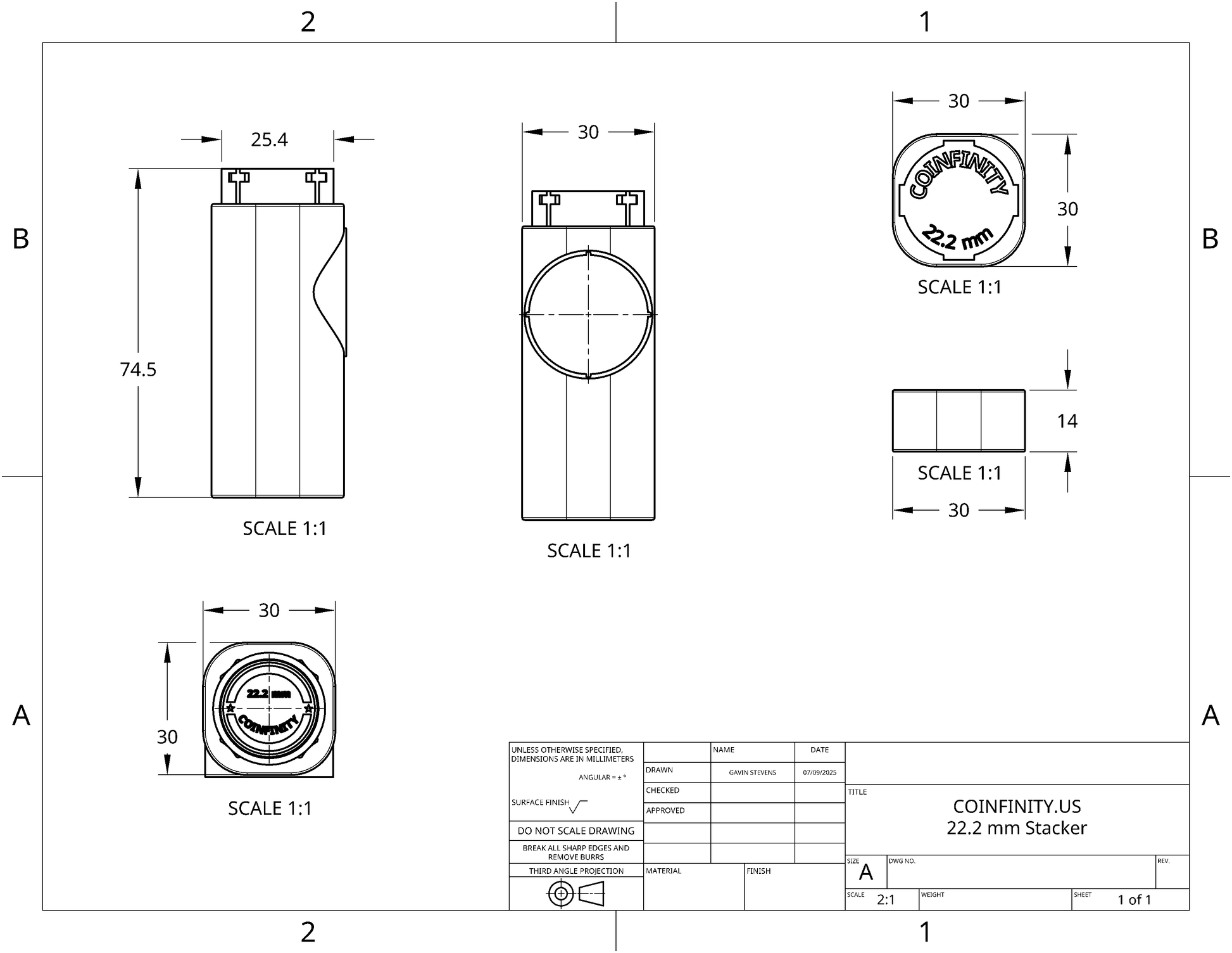 Each stacker comes with a 25mm NFC tag embedded in the tube wall (not the lid), enabling quick tap-to-scan functionality using the COINFINITY App, available for both iOS and Android. With the app, you can view or update information about the coin inside—like mint, year, purchase value, and condition.